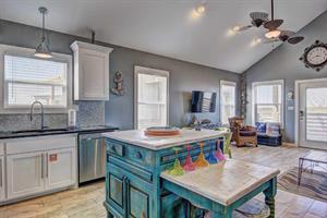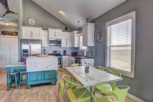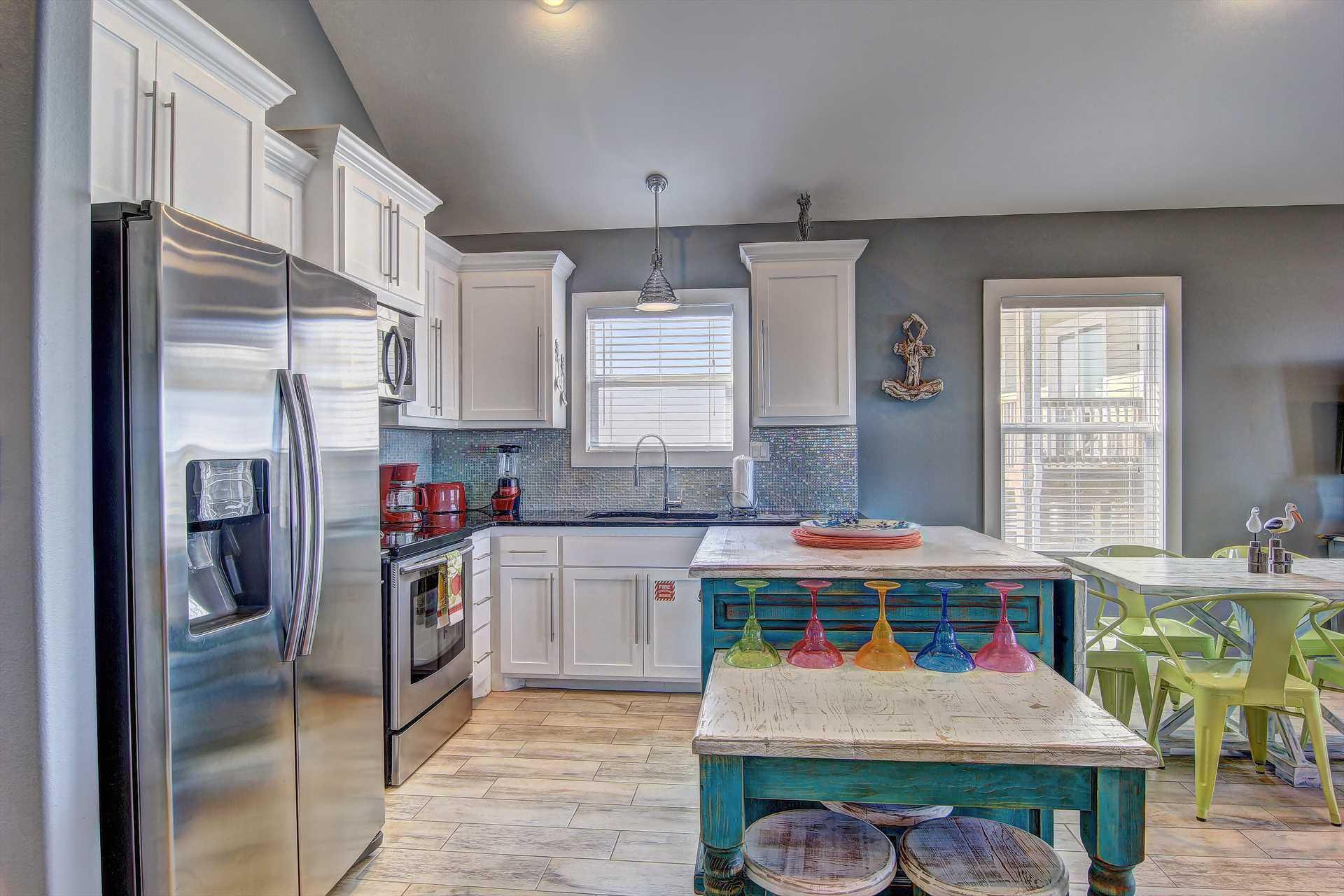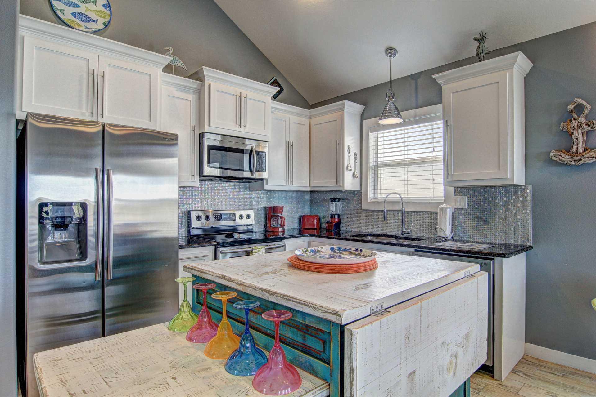 additional seating along the kitchen island. The kitchen is stocked with basic