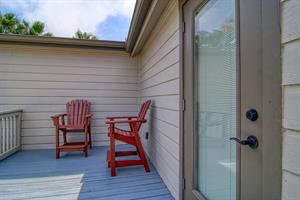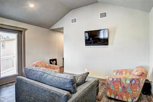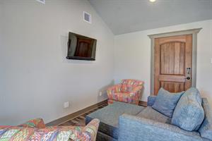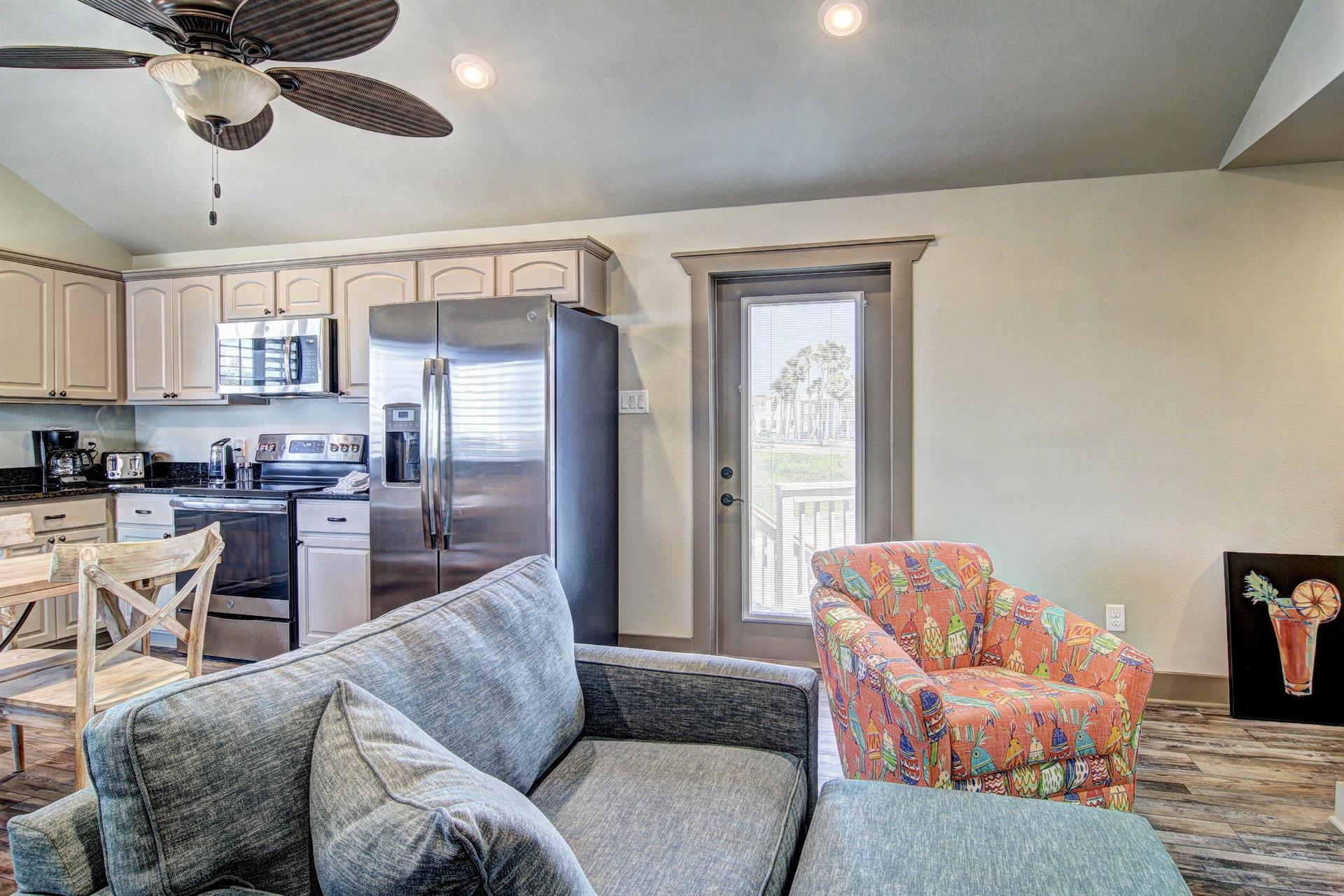 area has a full kitchen and a sleeper sofa. Located off the living room is a