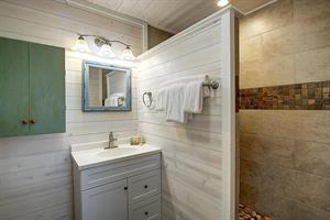 countertops, shiplap, vinyl flooring, tiled bathrooms and a breakfast bar.