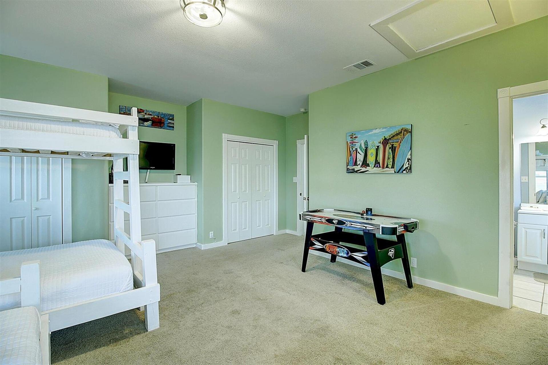 bathrooms. One, with two queen size beds, the second with two bunks, twin over