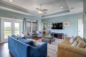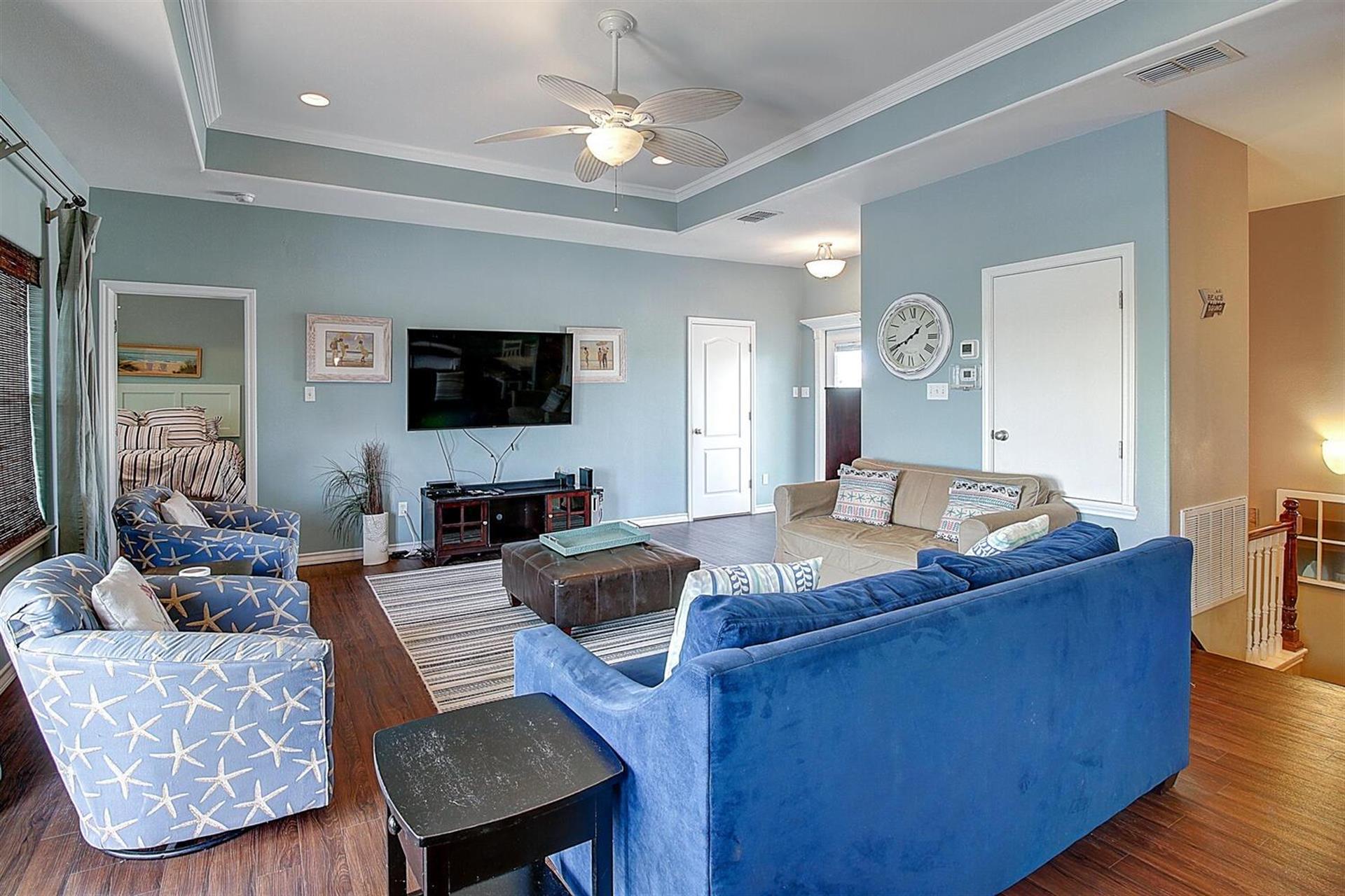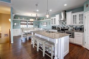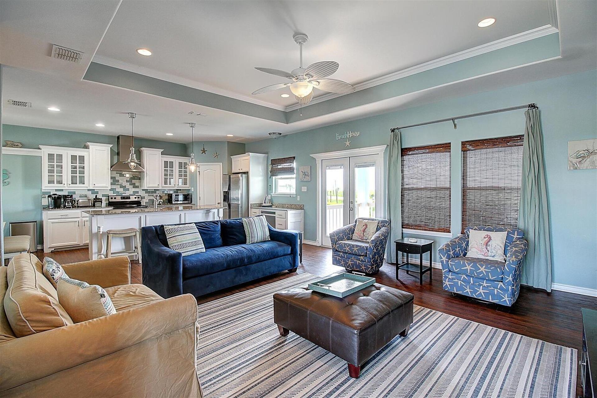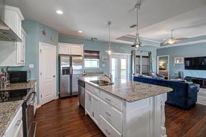 The family room and open kitchen are upstairs covered by tall ceilings and