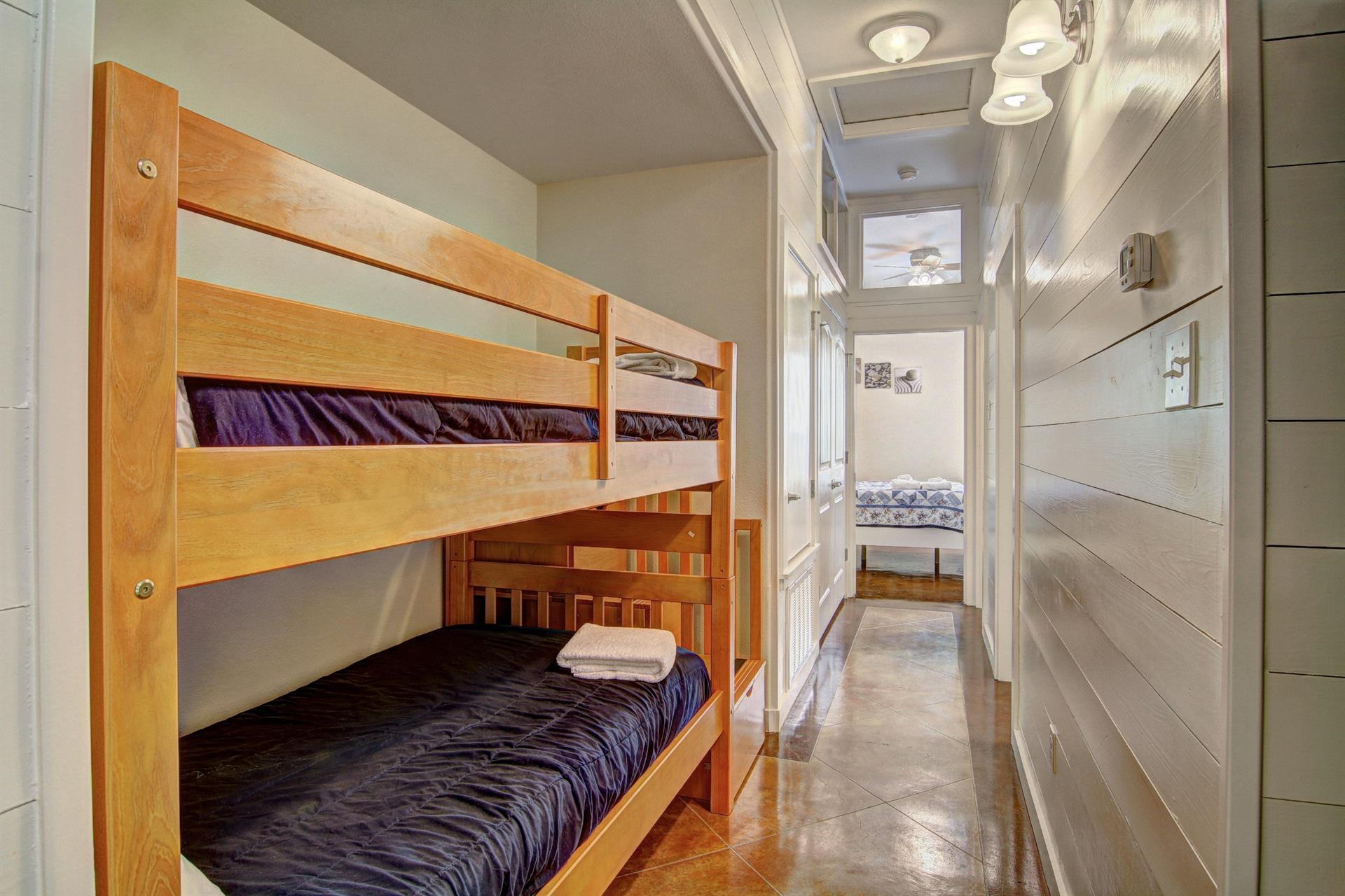 queens and private baths. There is a set of built in bunk beds in a hallway.