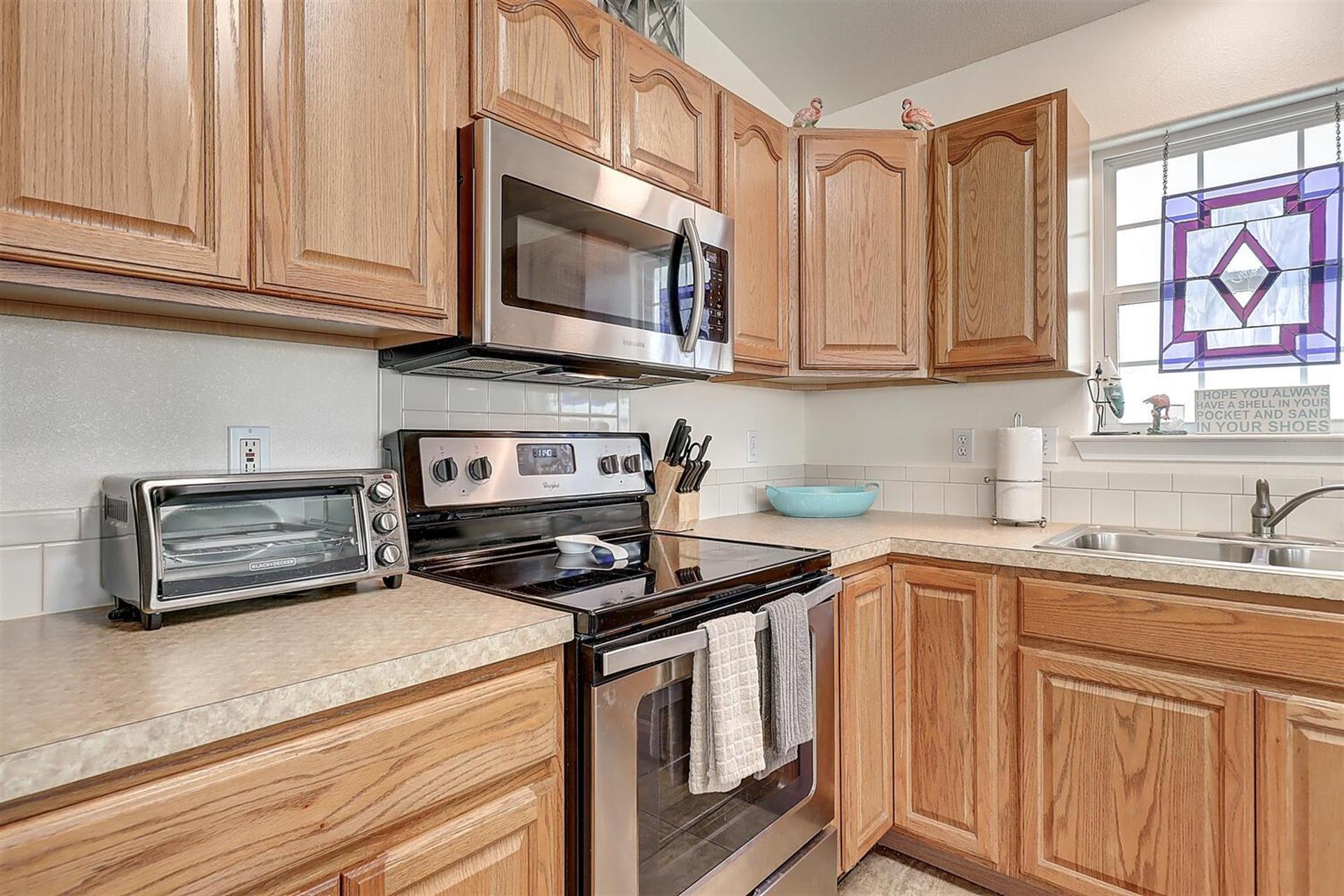 refrigerator, stove, microwave, breakfast bar, coffee maker, assorted cookware