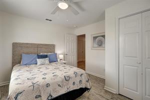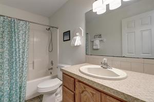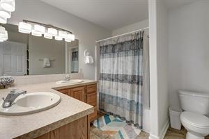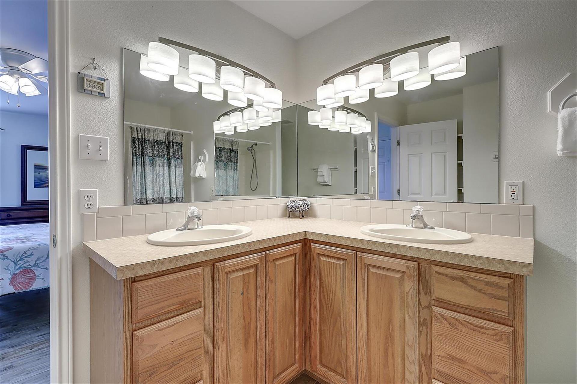 large bathroom with double sinks. The second bedroom has a queen-size bed